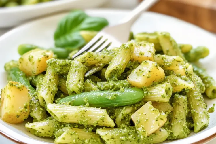 Basil Pesto Pasta is a vibrant and quick dish that combines al dente pasta with green beans and potatoes, enveloped in aromatic pesto.