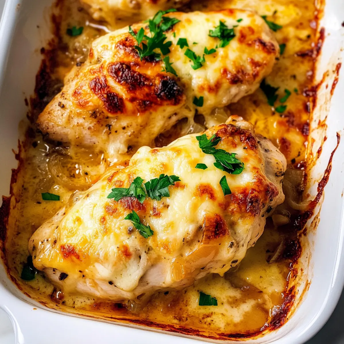 Once baked, switch your oven setting to broil and cook for an additional 2 minutes. This step creates a beautifully browned crust on the cheese, elevating the presentation of your Cheesy French Onion Chicken.
