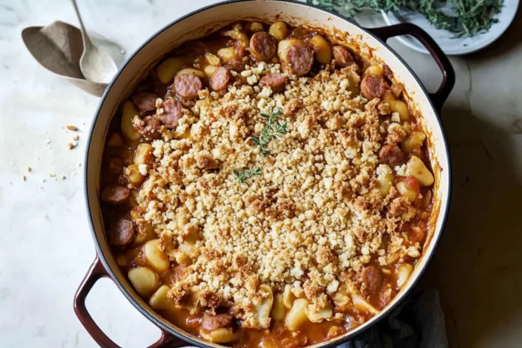 Sprinkle the breadcrumb mixture evenly over the Chicken and Sausage Cassoulet in the skillet. Place the skillet in the preheated oven and bake for about 20 minutes. Keep an eye on it, and remove it once the breadcrumbs are golden brown and the sides are bubbling, creating a deliciously inviting aroma in your kitchen.