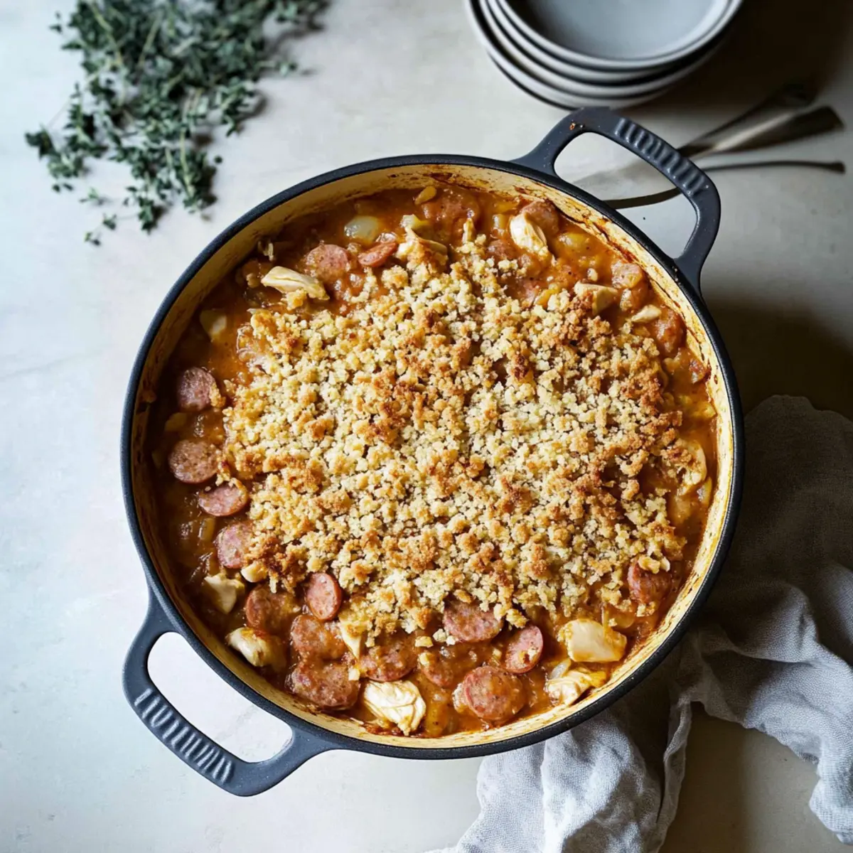 In a small bowl, combine the fresh breadcrumbs with the remaining olive oil, mixing until the breadcrumbs are coated. This mixture will form a delightful, crunchy topping over your Chicken and Sausage Cassoulet, ensuring a textural contrast to the hearty filling beneath.