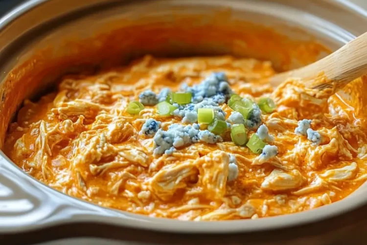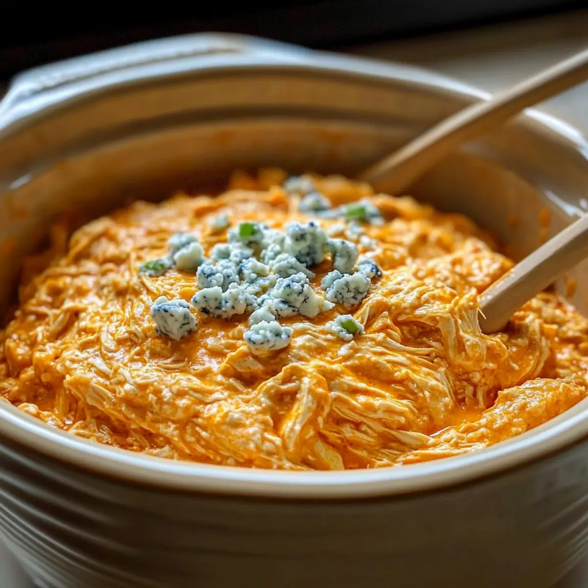 Stir in the shredded cheddar cheese and optional blue cheese crumbles, mixing them thoroughly until evenly combined. Allow the dip to cook for an additional 15 minutes on low, or until bubbling and the cheeses have melted to a gooey delight. This will ensure that the Creamy Buffalo Chicken Dip achieves that luscious texture everyone craves.