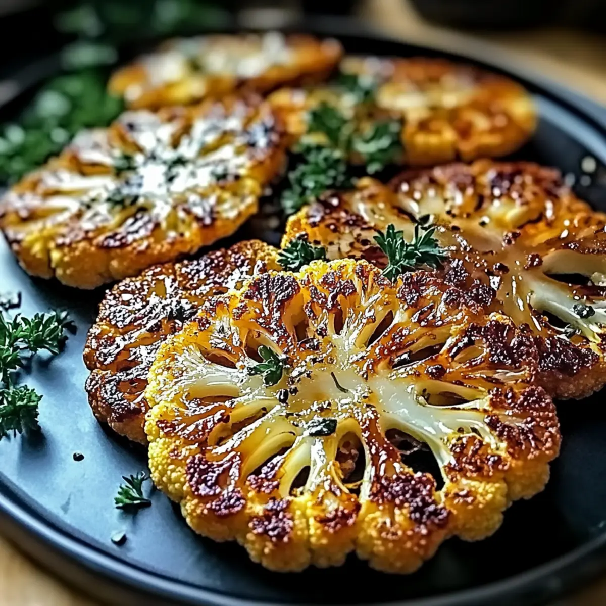 Once baked, remove the cauliflower steaks from the oven and let them cool briefly on the baking sheet. After a few minutes, you can garnish them with freshly chopped herbs like parsley or cilantro for a burst of color and freshness. This final touch will enhance the presentation and flavor of your Crispy Baked Cauliflower Steaks.