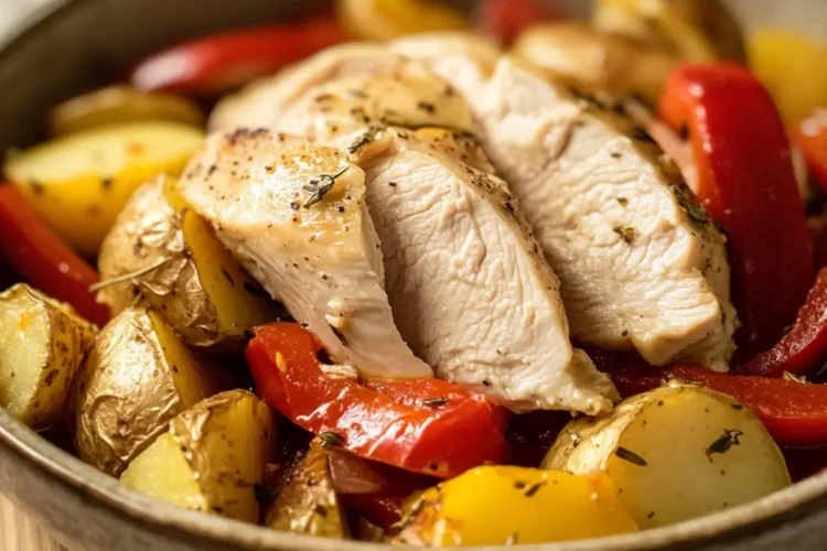 - Prep the ingredients by chopping potatoes into 1-inch cubes and slicing the red bell pepper into strips. Season chicken breasts with salt, pepper, and dried herbs.