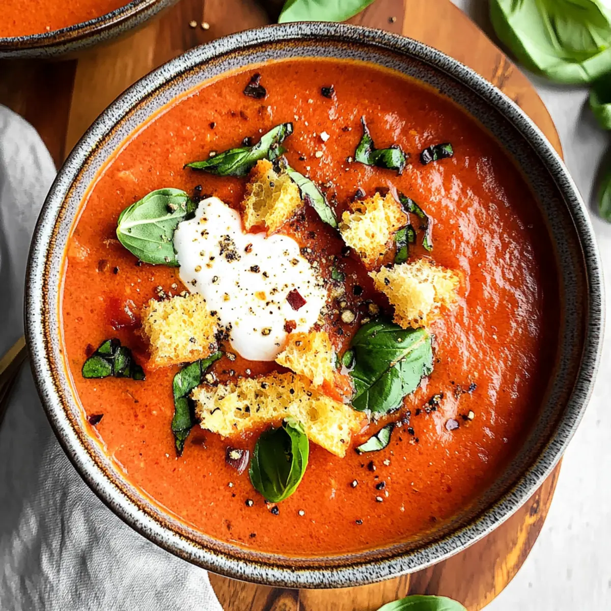 Ladle the hot soup into bowls and garnish with optional toppings such as a drizzle of cream, a sprinkle of Parmesan cheese, or more fresh basil. This not only enhances the presentation but also adds an extra layer of flavor, making each bowl a comforting treat. Enjoy your delicious creation!