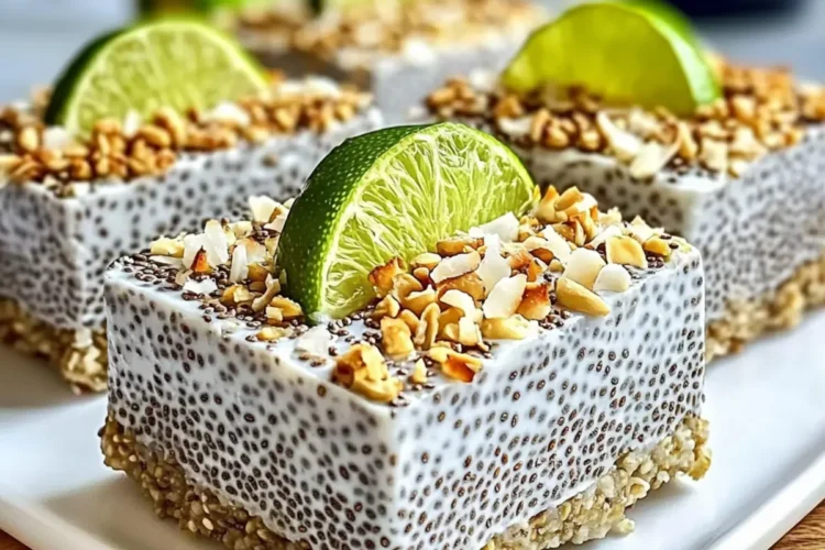 Once the bars are firm and set, remove them from the refrigerator and lift them out of the pan using the parchment paper. Top the bars with toasted coconut flakes and a sprinkle of additional lime zest for an eye-catching finish. These toppings enhance the tropical flavors of your No-Bake Chia Pudding Bars and add extra texture.
