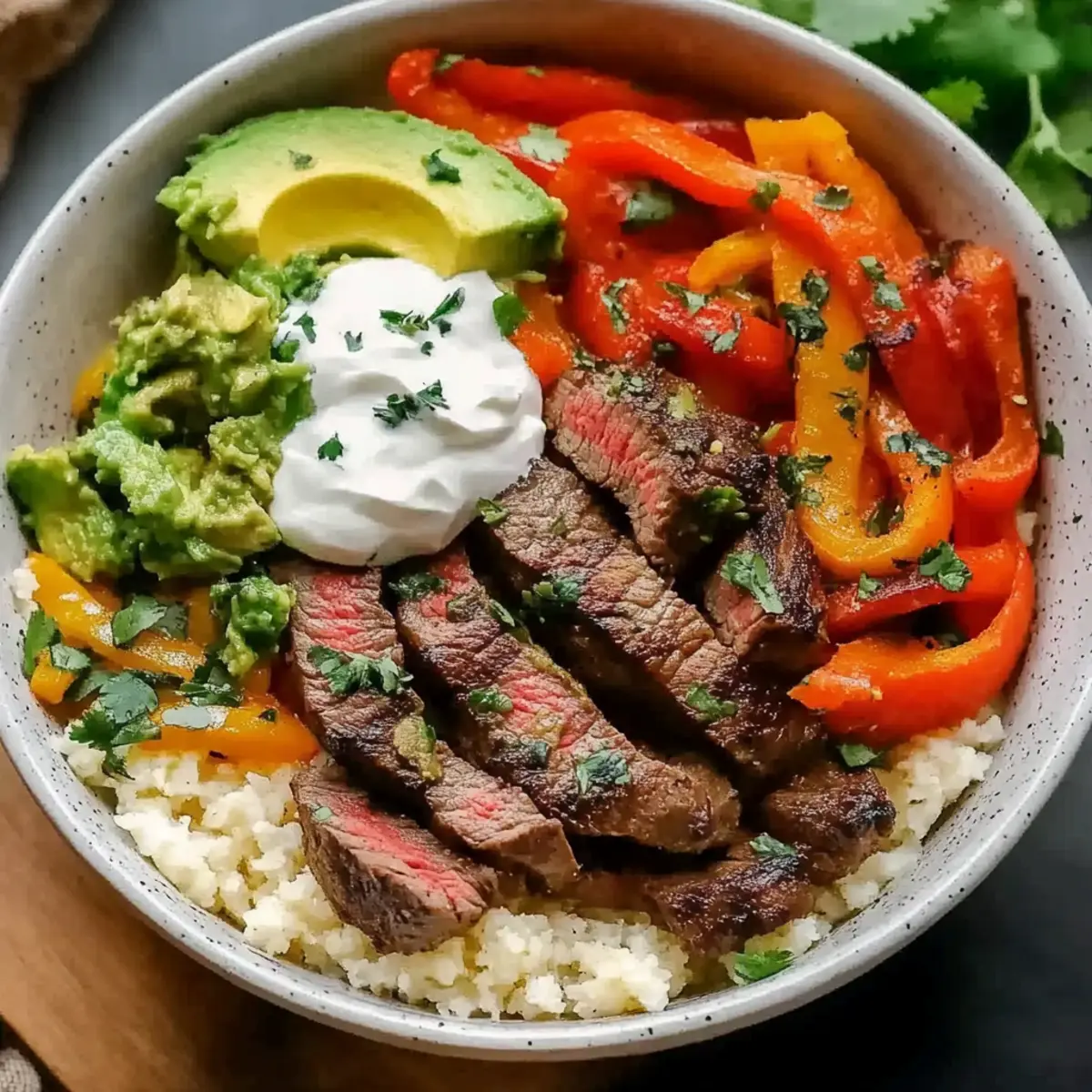 5. Assemble the Bowl: Spoon cauliflower rice into bowls, top with steak and vegetables, add avocado and Greek yogurt, and garnish with cilantro and lime juice.