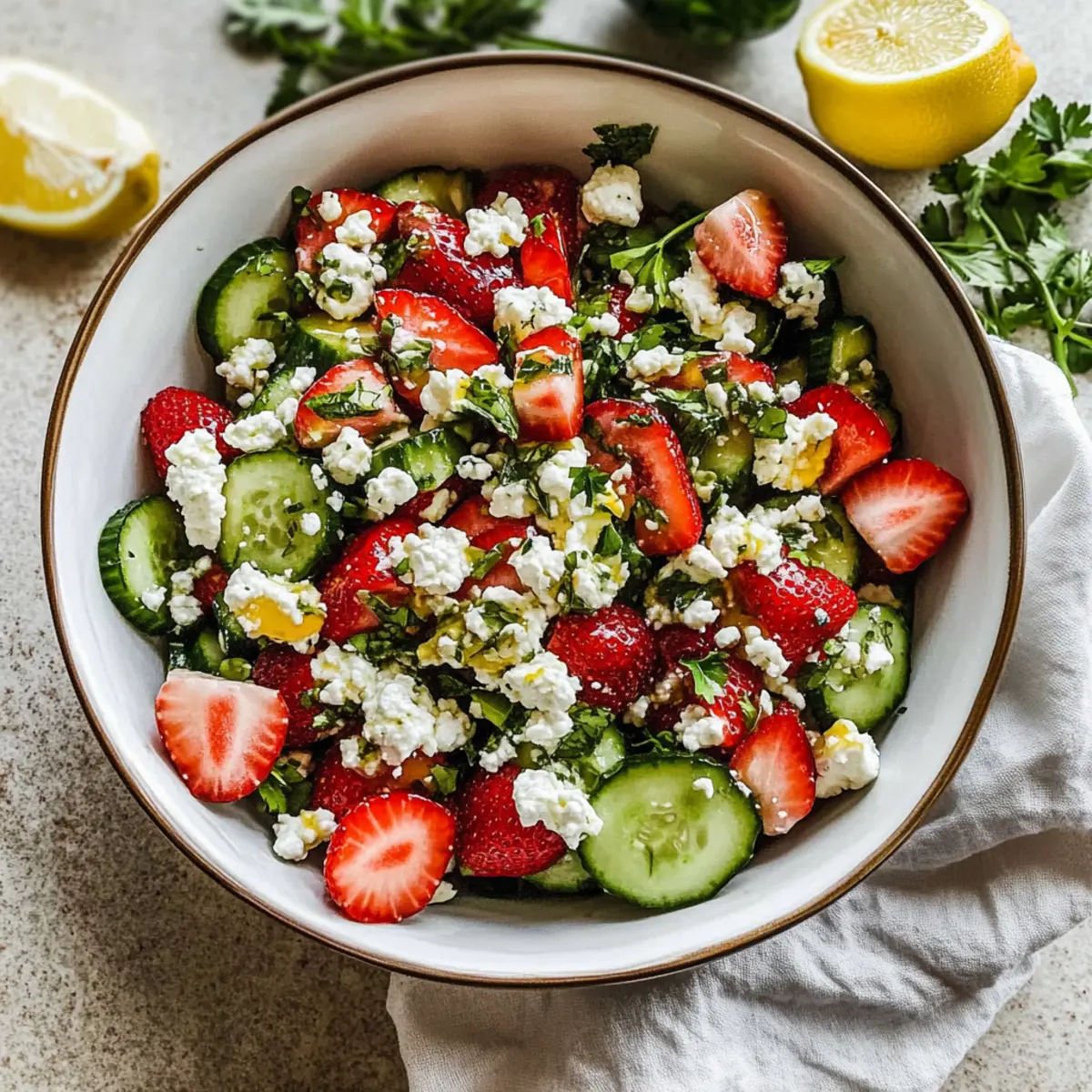 Vibrant Ingredients: Fresh strawberries and cucumbers create a stunning visual feast, while creamy feta adds richness that’s hard to resist.